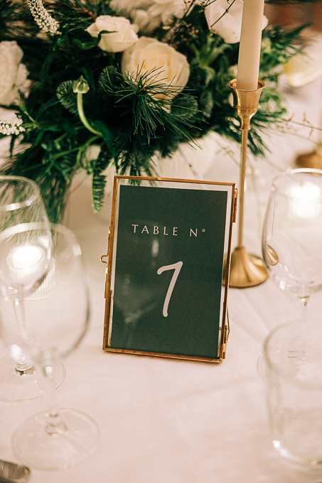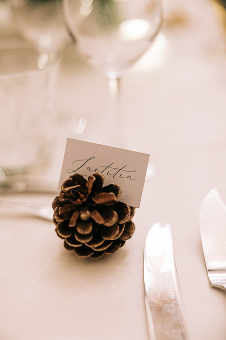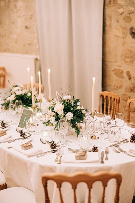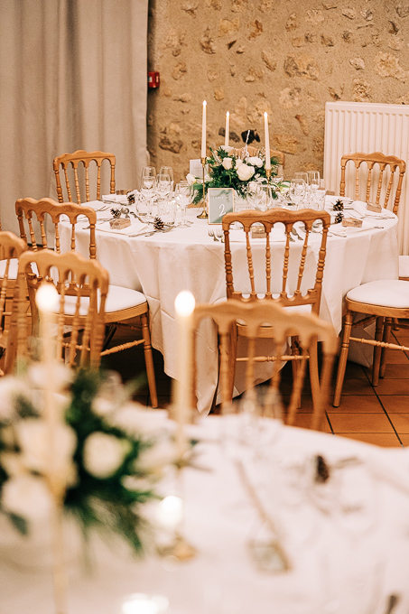 La réception, organisée dans les espaces intérieurs de la Ferme d’Abbeville, illustre parfaitement le potentiel d’un mariage en hiver. Tables en bois, décorations sobres, fleurs de saison et lumière chaude composent un décor élégant et cohérent.