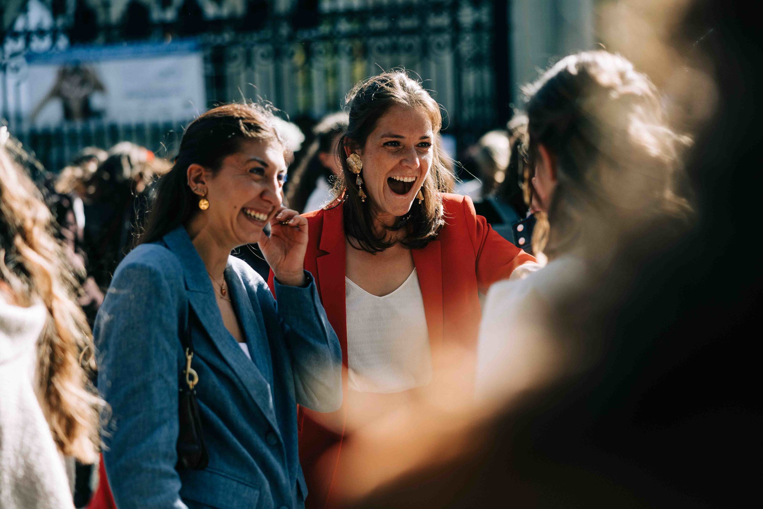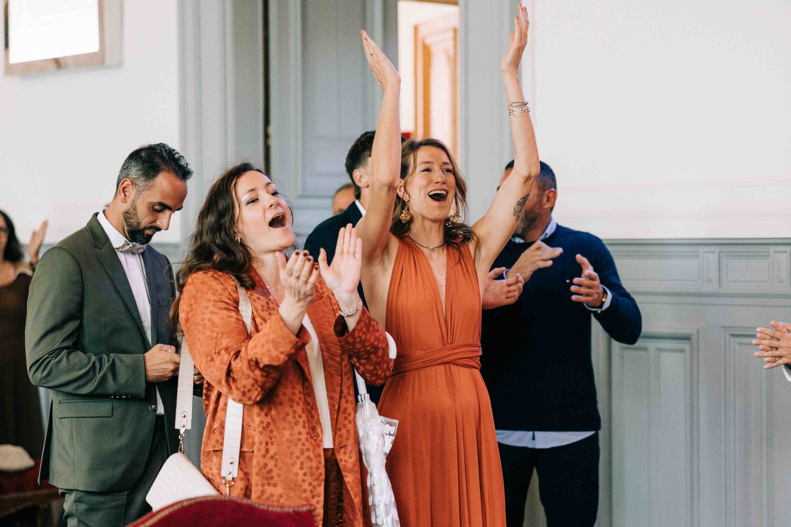 Les mariés sont arrivés en douceur, portés par une joie tranquille. Pas d’excès, pas de grandiloquence — juste une vérité nue, simple et belle. Les marches de la mairie les ont accueillis comme un seuil, une frontière douce entre deux vies qui décident de se tenir la main. Et tout autour, des regards, des sourires, des émotions suspendues dans l’air comme des bulles claires.
