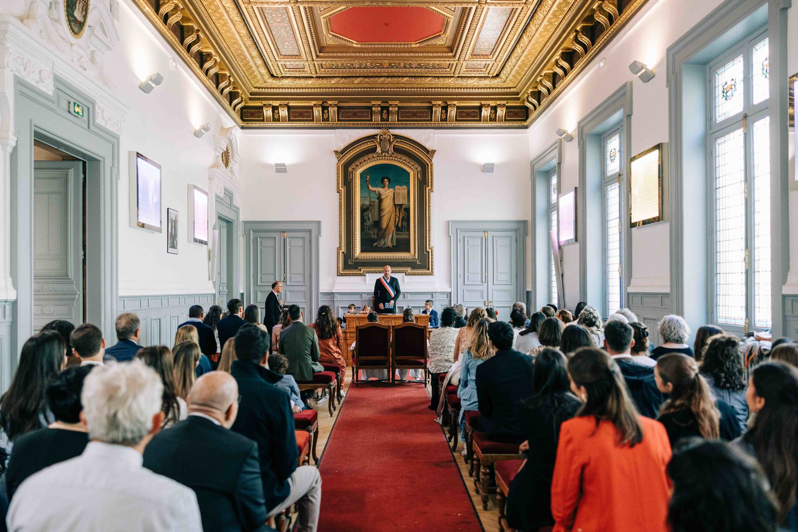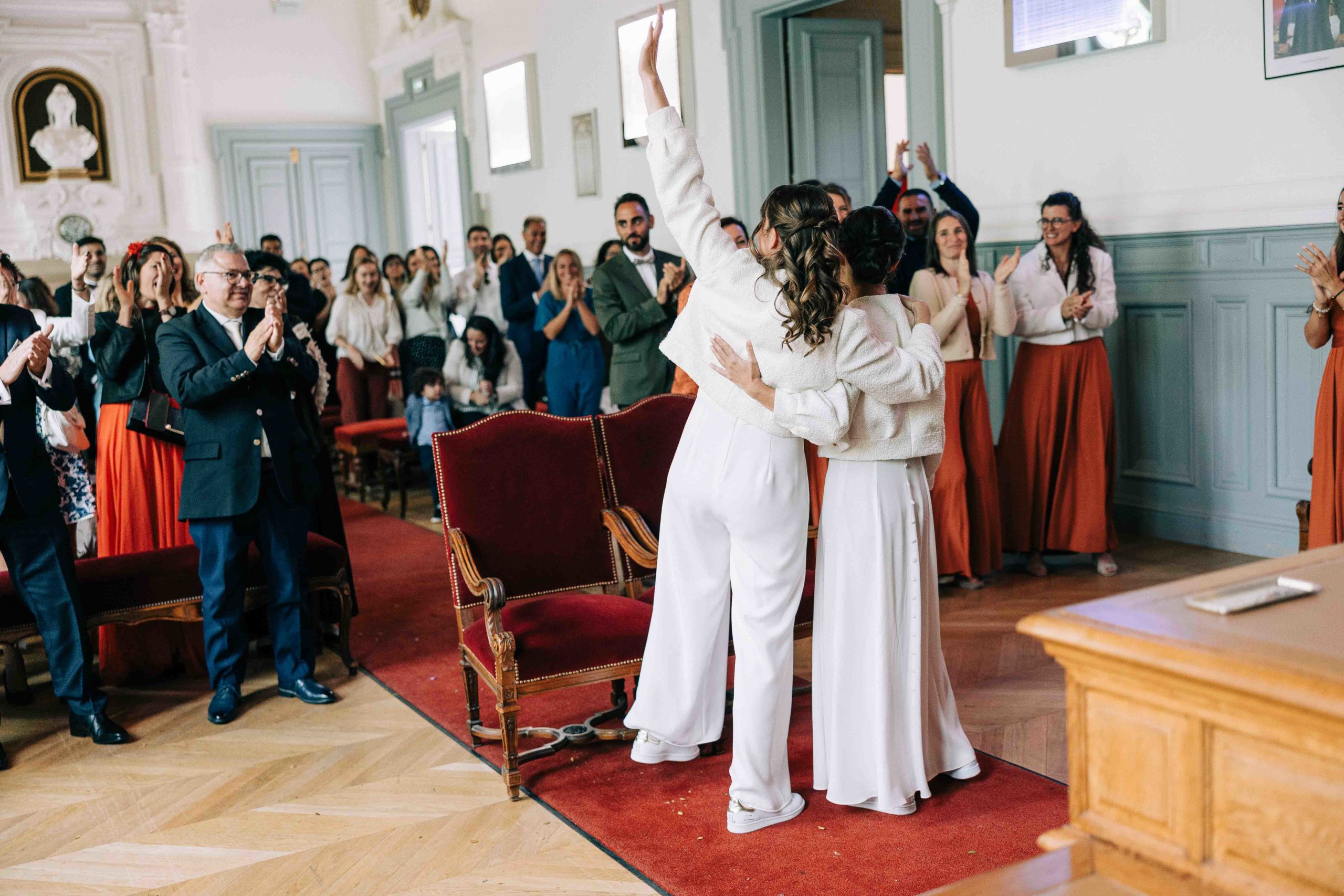 C’est dans cette atmosphère de lumière maîtrisée que Pierre Atelier s’est glissé — discret comme une ombre bienveillante, précis comme une respiration juste. Connu pour ses collaborations avec Vogue, Elle et Grazia, il a cette façon singulière de saisir les moments sans les figer. Ses images ne racontent pas seulement ce qu’on voit : elles racontent ce qu’on ressent. Ce jour-là, la salle des mariages baignait dans une lumière claire. Les mains se sont jointes, les alliances ont brillé, les oui ont résonné comme des souffles. Et Pierre a su capter tout cela — non pas avec un appareil, mais avec une écoute silencieuse du monde.