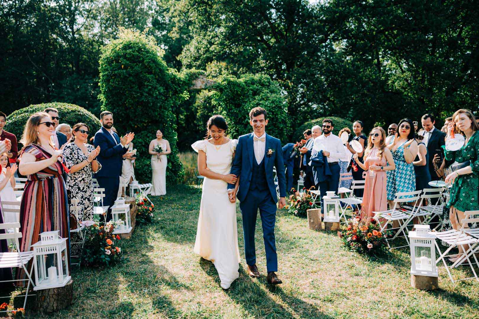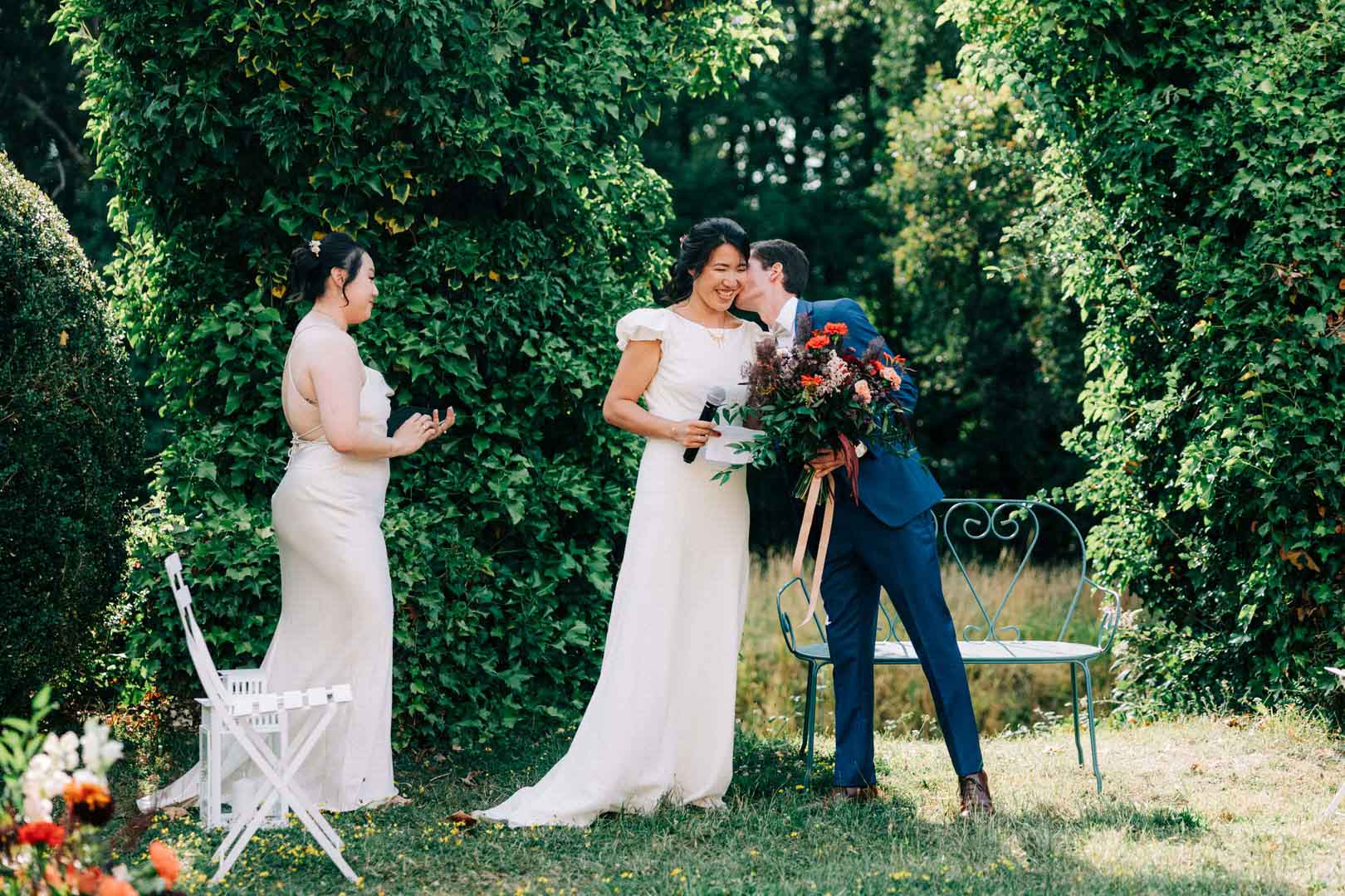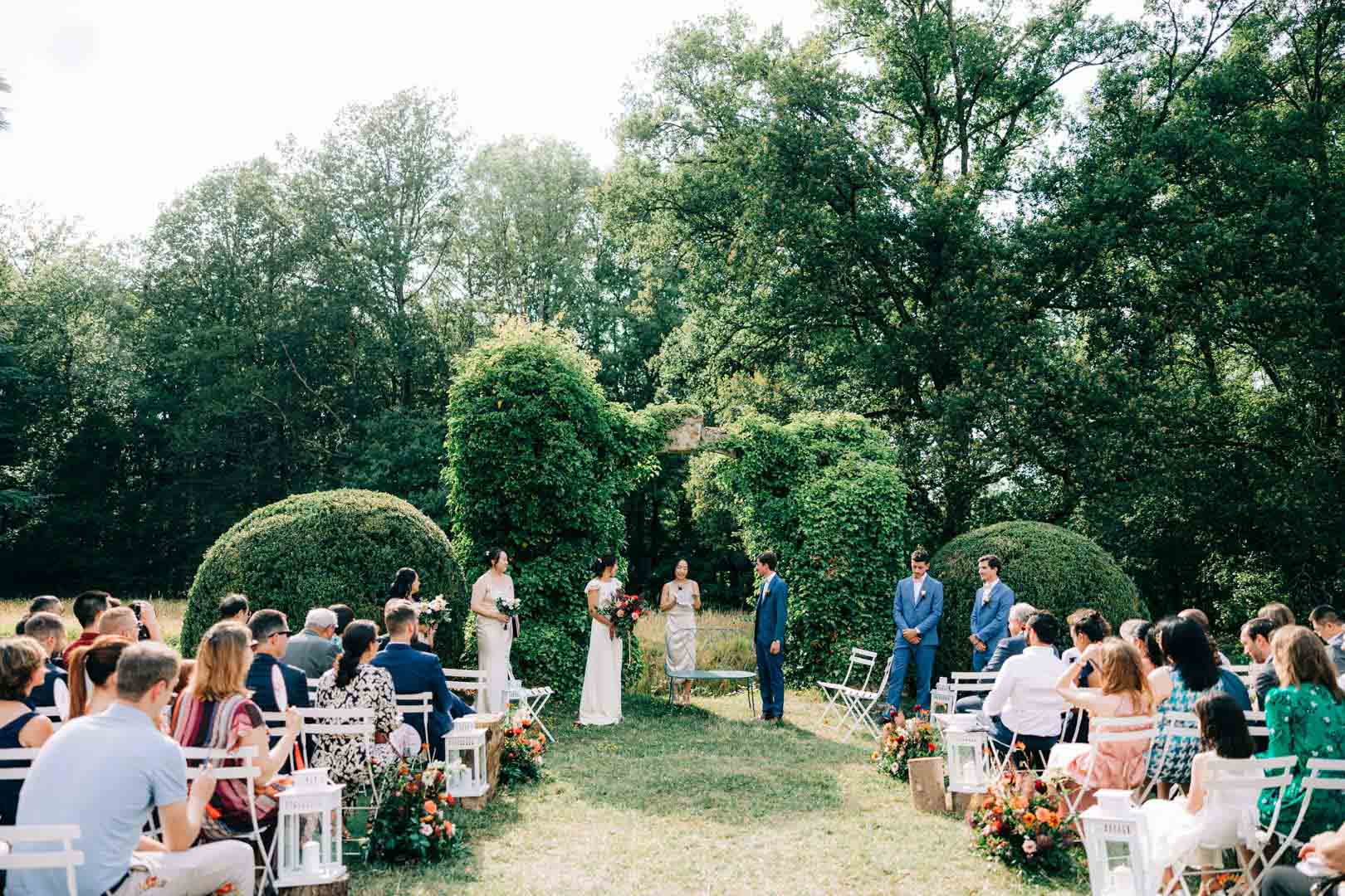 La cérémonie s’est déroulée en extérieur, entourée de verdure et baignée par une lumière douce de fin d’après-midi. Les cérémonies laïques permettent aux couples de construire un moment profondément personnel, rythmé par des discours, des échanges de vœux et de nombreux instants d’émotion.