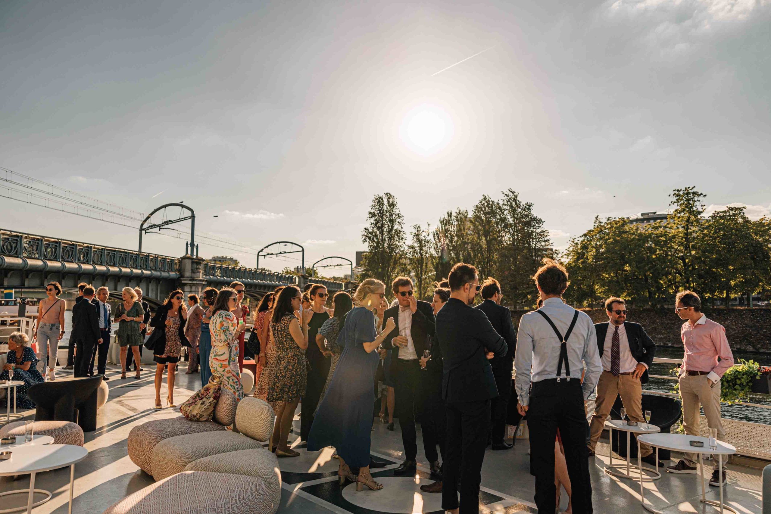 Les invités se retrouvent souvent sur le pont extérieur de la péniche pendant la cérémonie. Paris devient alors le témoin discret de ce moment : les façades haussmanniennes, les ponts historiques et parfois même les passants qui saluent les mariés depuis les quais.
