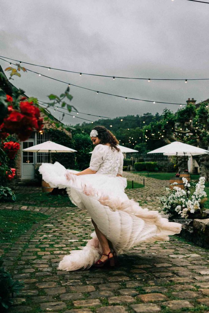 Sous les nuages gris, les gouttes de pluie créaient une symphonie délicate en touchant le sol et les feuilles des arbres environnants. Les invités, munis de parapluies colorés, ajoutaient une touche de gaieté à cette scène. La mariée, avec une nonchalance charmante, laissait traîner sa robe légèrement mouillée sur l’herbe, ses cheveux délicatement humides encadrant son visage radieux. Le marié, dans son costume impeccable, ne semblait pas se soucier de l’eau qui perlait sur ses épaules. Cette pluie, loin d’être un obstacle, devenait une compagne, rendant chaque moment encore plus précieux et unique.